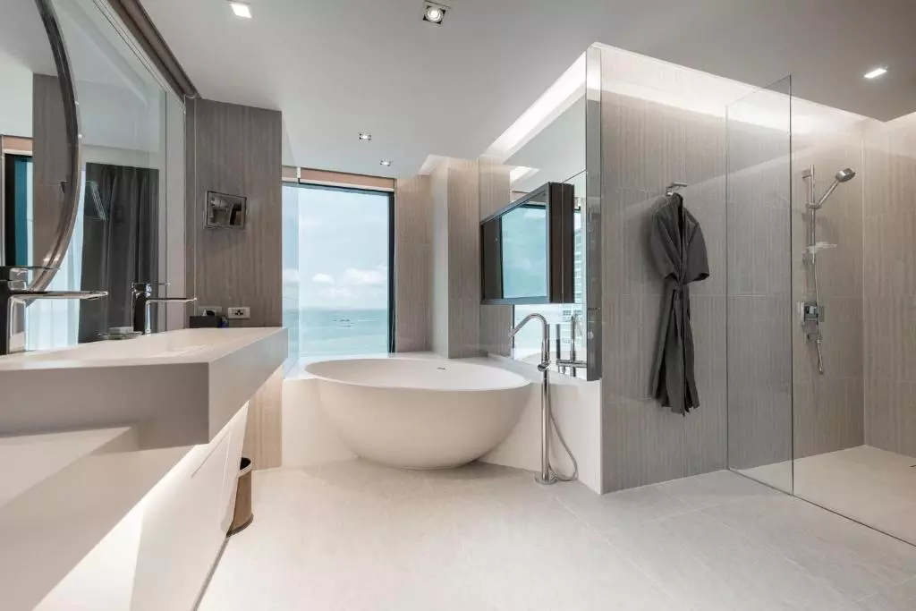 استخر بینهایت (Infinity Pool) روباز با منظره خلیج پاتایا و skyline شهر (داغ و مناسب برای غروب آفتاب).