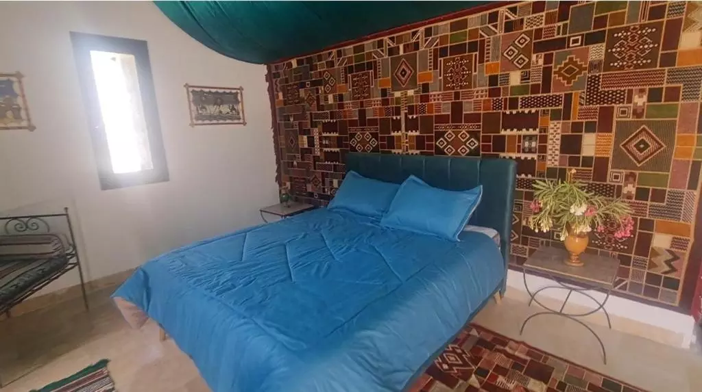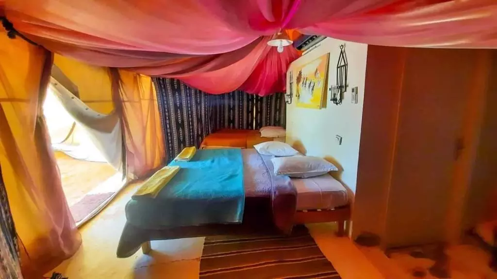 اقامت: ۶۰ اتاق چادری (tented rooms) با حمام اختصاصی (en suite). چادرها در اطراف واحه کوچک هتل قرار گرفتهاند و طراحی سنتی بربر (Berber) دارند، با دکوراسیون محلی، تختهای راحت، و تهویه مناسب برای گرمای صحرا. برخی اتاقها بالکن یا پنجرههای بزرگ رو به نخلستانها یا تپههای شنی دارند.